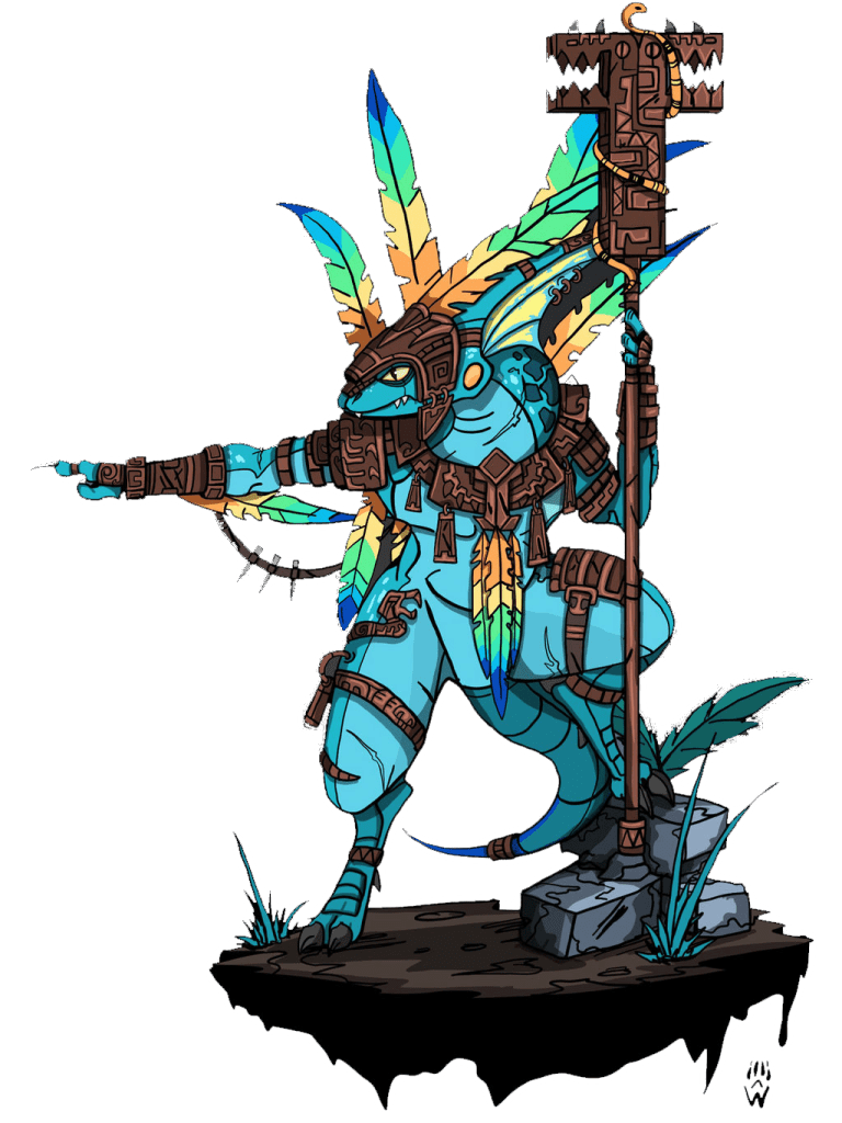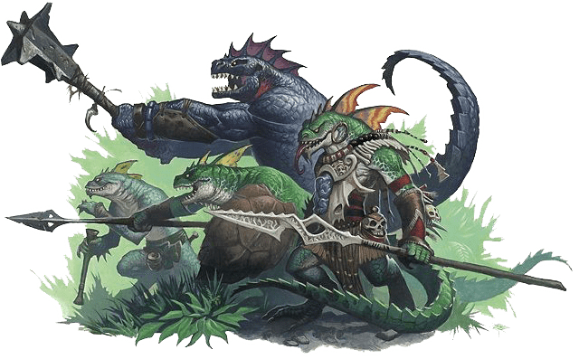 Como elección de héroes, tenemos a un Sacerdote Eslizón (jefe de la banda), un Guerrero Tótem Saurio y 2 Eslizones de Gran Cresta. Como secuaces, tenemos a los Bravos Eslizones, los Bravos Saurio (que siempre deben estar mínimo un número por debajo de los bravos eslizones) y un único Króxigor.